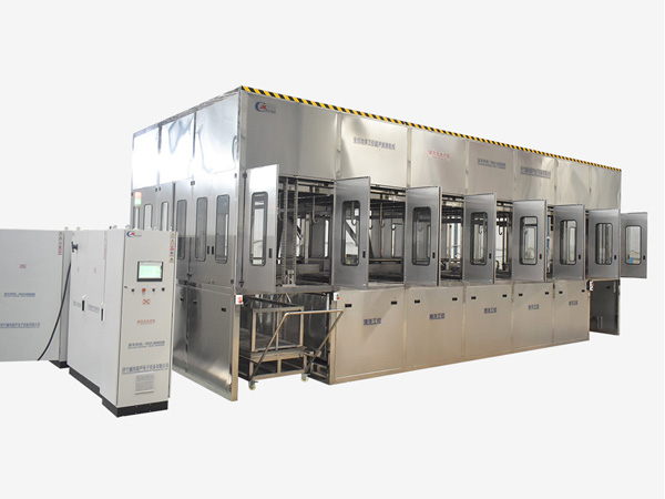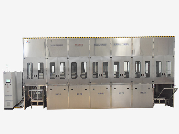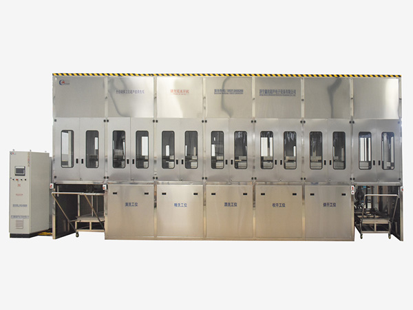 該設備為全自動高潔凈度清洗烘干機,采用超聲波清洗工藝。整機采用2套龍門桁架式傳動機構,PLC+觸摸屏控制。該設備共七個工位:上料工位、超聲波清洗工位、超聲波漂洗工位、鼓泡漂洗工位、高壓風切工位、熱風干燥工位、下料工位。該設備還包含霧氣處理裝置、循環過濾、拋動裝置、管路系統及智能電器控制系統等組成。該設備清洗效果好、提高了工件的清潔度。該機結構設計及工藝安排合理、自動化程度高、清洗精度高,有效解決了此類工件的清洗難題。