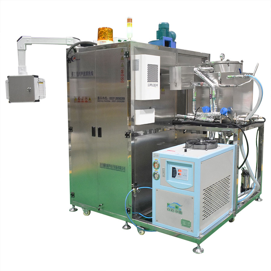 該設備為高潔凈度清洗機,采用碳氫超聲波清洗工藝。該設備由超聲波清洗槽、蒸汽浴洗槽、清洗網框、清洗槽冷凝區、分水器、工業冷水機、溶劑回收機、管路系統、智能控制系統等組成
